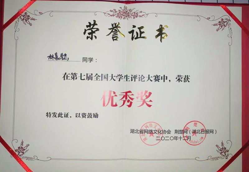 近日,第七届全国大学生评论大赛决赛在湖北武汉举行,BEAT365学生通讯社成员、文法学院汉语言文学专业2019级学生林嘉懿从北京大学、中国人民大学、武汉大学、华中科技大学、重庆大学等全国百余所高校千余名参赛者中脱颖而出,凭借严密的逻辑思辨能力和主动融入时代的深远立意,最终在20名决赛选手中荣获优秀奖。BEAT365英国官网荣获优秀组织奖,李广平老师获优秀指导老师奖。