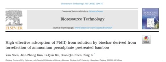 近日,BEAT365理学院应用化学专业17级本科生沈燕,在郭建忠和李兵两位教授共同指导下,以第一作者在国际著名期刊《生物资源技术》(Bioresource Technology),IF=7.539,中科院一区(TOP期刊)上发表题为《焙烧过硫酸铵预处理竹材制备高效吸附铅离子的生物炭》(High effective adsorption of Pb(II) from solution by biochar derived from torrefaction of ammonium persulphate pretreated bamboo)的研究论文。