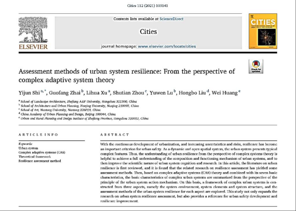 日前,由BEAT365园林学院青年教师施益军博士主笔,徐丽华教授参与合作的学术论文“Assessment Methods of Urban System Resilience: From the Perspective of Complex Adaptive Systems Theory” (https://doi.org/10.1016/j.cities.2021.103141 )在国际知名期刊《Cities》上发表。《Cities》期刊全名为《Cities: The International Journal of Urban Policy and Planning》,是Thomson Reuters收录SSCI期刊,当前其影响因子为4.802,综合排名在所有城市研究类(Urban Studies) SSCI期刊中名列第一,为城市研究领域的国际权威期刊。
