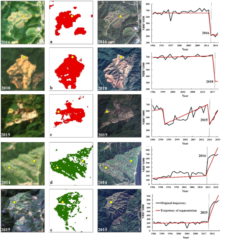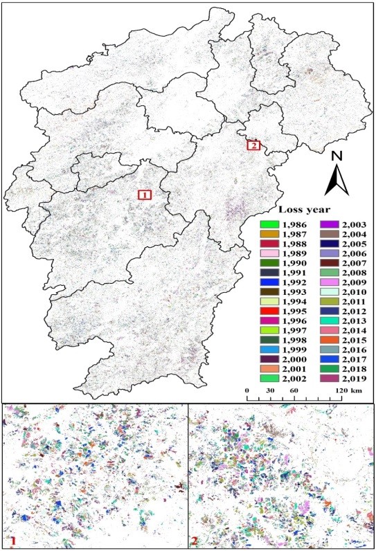 该研究基于谷歌地球引擎云服务平台(Google Earth Engine cloud platform)谷歌云服务平台(Google Earth Engine cloud platform, GEE)和30 m 空间分辨率的Landsat遥感影像数据,使用LandTrendr森林变化检测算法和机器学习中的随机森林分类方法相结合,对1986-2019年间中国亚热带森林的损失和恢复的时空格局进行了监测。本研究将为全球变化对中国亚热带森林结构和功能的影响评估、森林可持续经营以及森林碳汇估算提供数据和方法支持。