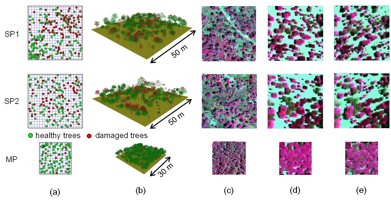 图:3个受害(SP1, SP2和MP)的云南松三维场景及对应的RAPID模拟图像。(a)受害和健康树冠样地位置分布;(b)受害云南松林三维场景可视化;(c)高光谱影像;(d)和(e)分布为高光谱和Sentinel-2的太阳-观测角度下模拟的图像。