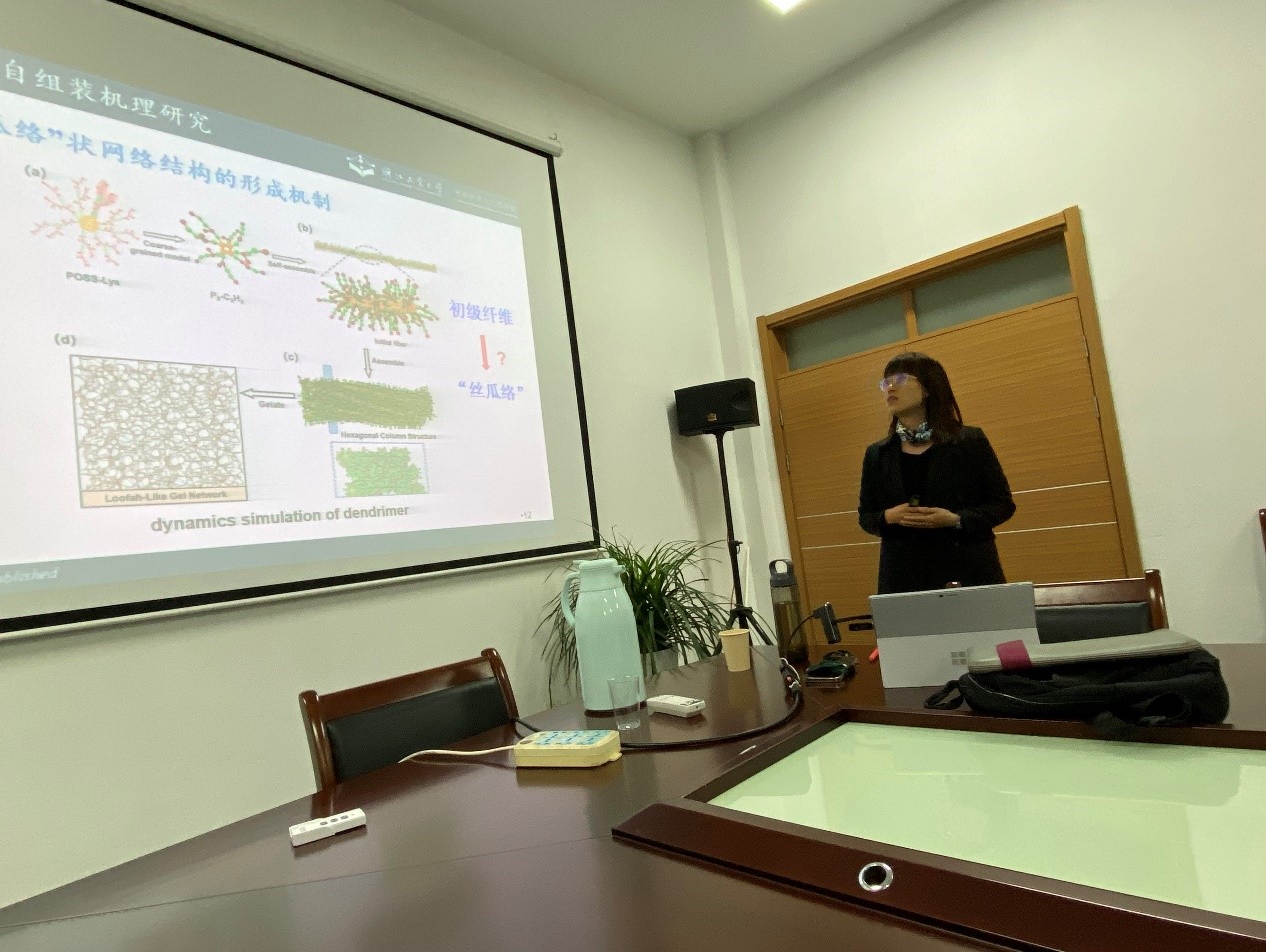 陈思结合自己所在科研团队研究经历,就“凝胶的分子网络设计及其应用研究”作了专题报告,详细介绍了超分子凝胶的自组装机理,以及凝胶材料在可拉伸显示、放疗间隔保护以及美白珍珠粉等柔性显示和生物医用领域中的应用。在交流讨论环节,陈思教授同师生们进行了互动交流,就相关研究内容及成果产业转化经验进行了深入探讨。