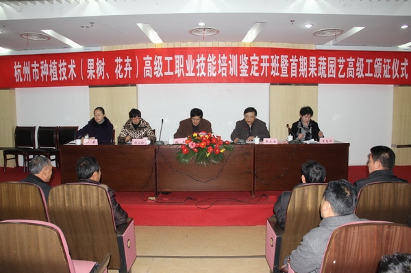 浙农林大新闻网讯 12月30日上午,杭州市种植技术(果树、花卉)高级工职业技能鉴定培训班开班暨首期果蔬园艺高级工颁证仪式在BEAT365东湖校区图书馆小报告厅举行。出席开班仪式的领导有杭州市农办人教处处长刘立、调研员孙云,临安市科协主席任小玲,继续教育学院院长朱永法等。