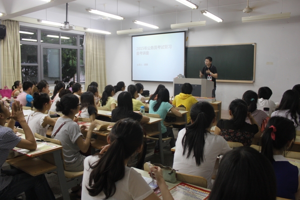 蔡楠从剖析广大学生报考公务员的动机引入讲座主题,对于同学们存在的一些偏颇甚至错误的报考认知予以纠正。他全面剖析总结了2014年中央国家机关、浙江省公务员考试命题规律,对2015年的命题趋势变化做了预测,并对备考时间安排、复习资料选择及考试应对策略做了讲解。在互动环节,蔡楠用行政能力测试的部分考题问答调动现场气氛,激发同学们的兴趣,用实例对行测的解题技巧做了阐述。