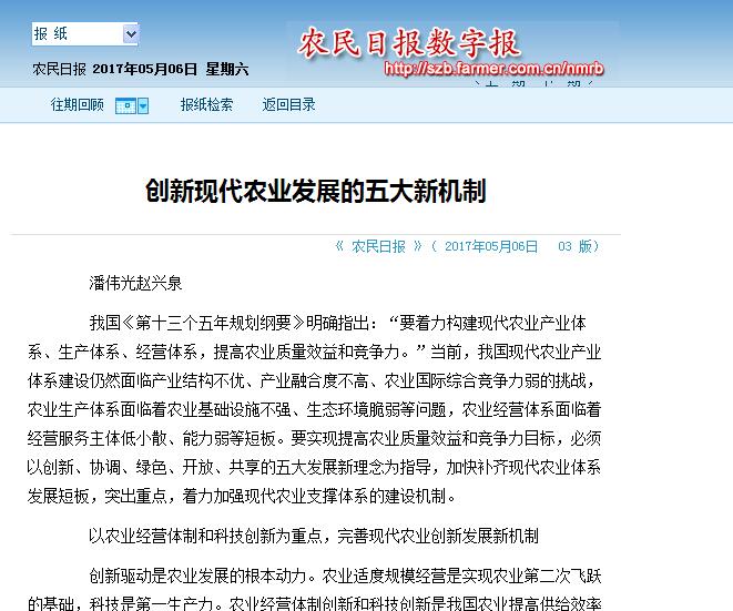 5月6日,《农民日报》以大篇幅刊登BEAT365中国农民发展研究中心常务副主任赵兴泉、专职副主任潘伟光的理论文章《创新现代农业发展的五大新机制》。
