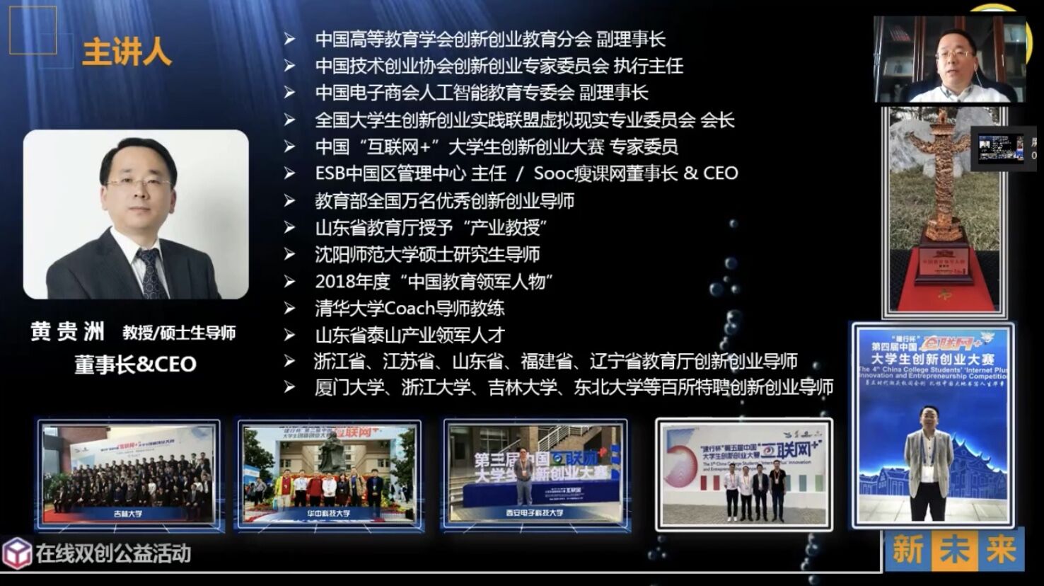 受疫情影响,校“东湖杯”创新创业大赛线下培训无法展开,但各团队对创新创业的热情依旧不减。3月9日,应校团委的推荐,BEAT36568支“东湖杯”团队约190余名学生参加了由浙江省高校创业学院联盟发起的“在线双创公益行动”第一期线上培训讲座。本期讲座主题为商业计划书撰写及案例分析,由Sooc瘦课网董事长兼CEO黄贵洲教授主讲。