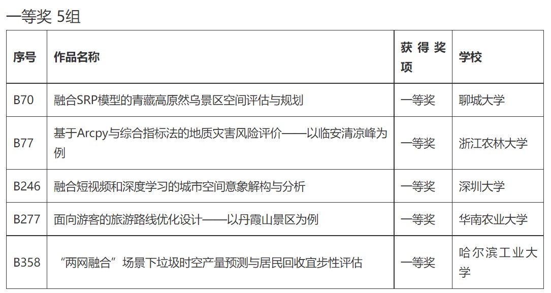其中在陈永刚等老师指导下,由环资学院的王琛、裴文杰、王恒哲、张静怡同学创作的《基于Arcpy与综合指标法的地质灾害风险评价——以临安清凉峰为例》获得地理设计组一等奖;俞海伟、许沛、茅佳滢、叶真妮同学创作的《夏季台风对滑坡的影响分析及其风险评价》获得地理设计组二等奖;黄霞、陈智雄、王子昕、吕新霖同学创作的《基于InSAR和指数分析的地面沉降风险评估与预测—以城市密集高层建筑区为例》获得地理设计组二等奖;金昊、刘彬菁、刘阳阳、施晓怡创作的《基于多源数据的城市宜居性评价——以长三角为例》获得地理设计组三等奖。