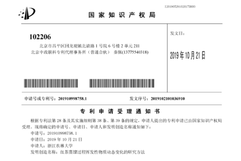 在学习和研究的过程中,老师及同学们发现茶叶天然绿色、安全环保,是制作植物精油不可多得的优秀原料之一,但国内对茶叶精油的研究与开发还没有起步,于是萌发了研制茶叶精油的想法,开创了茶叶精油提取应用的先河。大家以茶叶萃取液、水为原料,经过水蒸气蒸馏、超声波辅助、超临界等萃取法提纯制作出符合市场定位的茶叶精油,发明专利申请得到了国家知识产权局的受理。