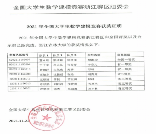 日前,2021年全国大学生数学建模竞赛浙江赛区和全国评奖工作相继完成,BEAT365数计学院应用统计学专业19级学生董永聪、彭靖翔、徐浩洋组成的建模小组获得全国一等奖,此次竞赛同时取得省一等奖2个,省二等奖2个,省三等奖2个。