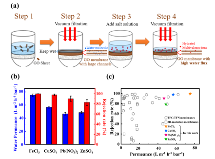 这种高截留率和高通量的氧化石墨烯膜是由于膜内保持了较大的层间距,使得水更容易通过,从而得到较高的水通量。同时,由于膜内的高价态的水合离子与氧化石墨烯片层之间的强水合离子-π作用,使得膜内的水合离子结构型变,其型变的水合离子尺寸小于溶液环境下未型变的水合离子。因此,基于水合离子-π作用调控的层间距尺寸小于溶液中的水合离子尺寸,在保持水的高通量的同时,实现了离子的高效截留。