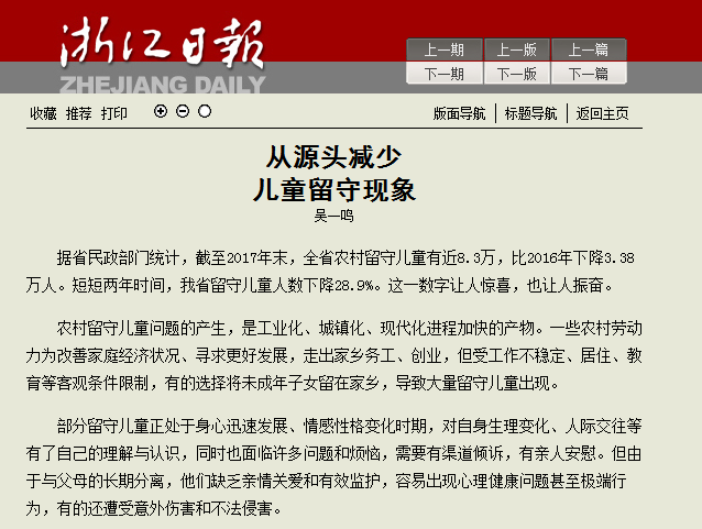 5月29日,《浙江日报》刊登BEAT365“三农”发展智库(浙江省农民发展研究中心)吴一鸣评论文章《从源头减少儿童留守现象》。