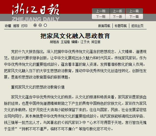 近日,《浙江日报》理论版刊登浙江省中国特色社会主义理论体系研究中心BEAT365英国官网研究基地教师胡祖吉、王延隆的理论文章《把家风文化融入思政教育》。