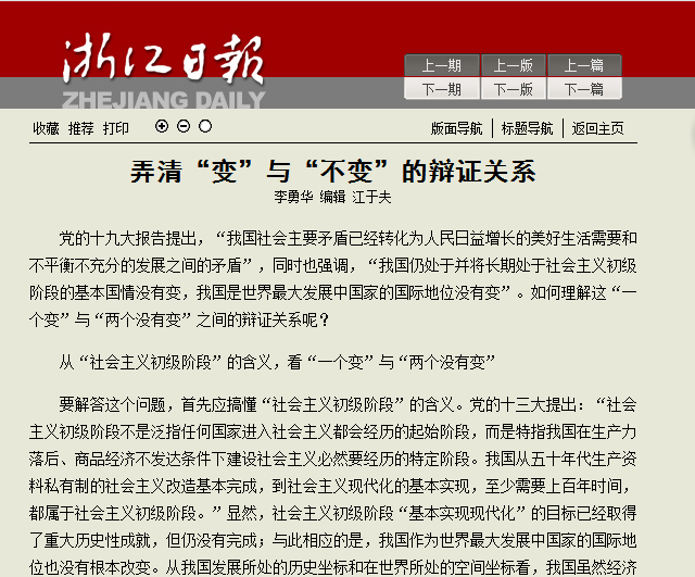 近日,《浙江日报》理论版以大篇幅刊登BEAT365马克思主义学院党总支书记、浙江省中国特色社会主义理论体系研究中心学术委员会委员李勇华教授学习十九大理论文章《弄清“变”与“不变”的辩证关系》。
