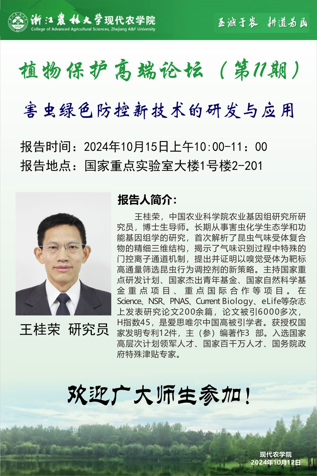 报告人简介:王桂荣,中国农业科学院农业基因组研究所研究员,博士生导师。长期从事害虫化学生态学和功能基因组学的研究,首次解析了昆虫气味受体复合物的精细三维结构,揭示了气味识别过程中特殊的门控离子通道机制,提出并证明以嗅觉受体为靶标高通量筛选昆虫行为调控剂的新策略。主持国家重点研发计划、国家杰出青年基金、国家自然科学基金重点项目、重点国际合作等项目。在Science、NSR、PNAS、Current Biology、eLife等杂志上发表研究论文200余篇,论文被引6000多次,H指数45,是爱思唯尔中国高被引学者。获授权国家发明专利12件,主(参)编著作3部。入选国家高层次计划领军人才、国家百千万人才、国务院政府特殊津贴专家。
