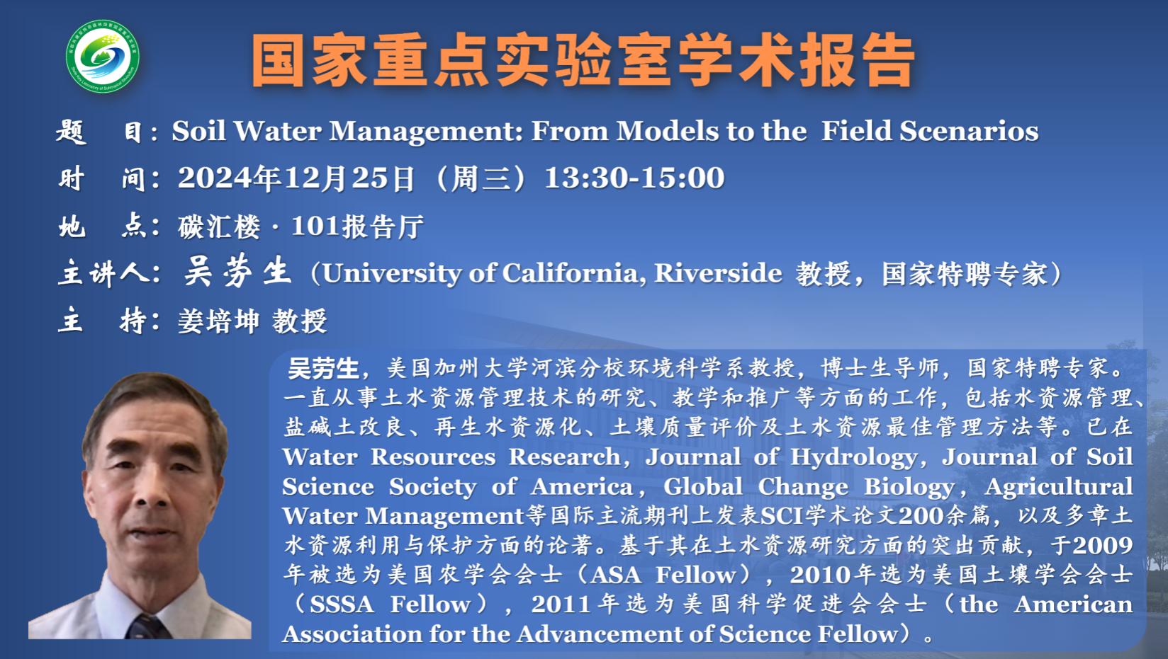 讲座预告:Soil Water Management: From Models to the Field Scenarios