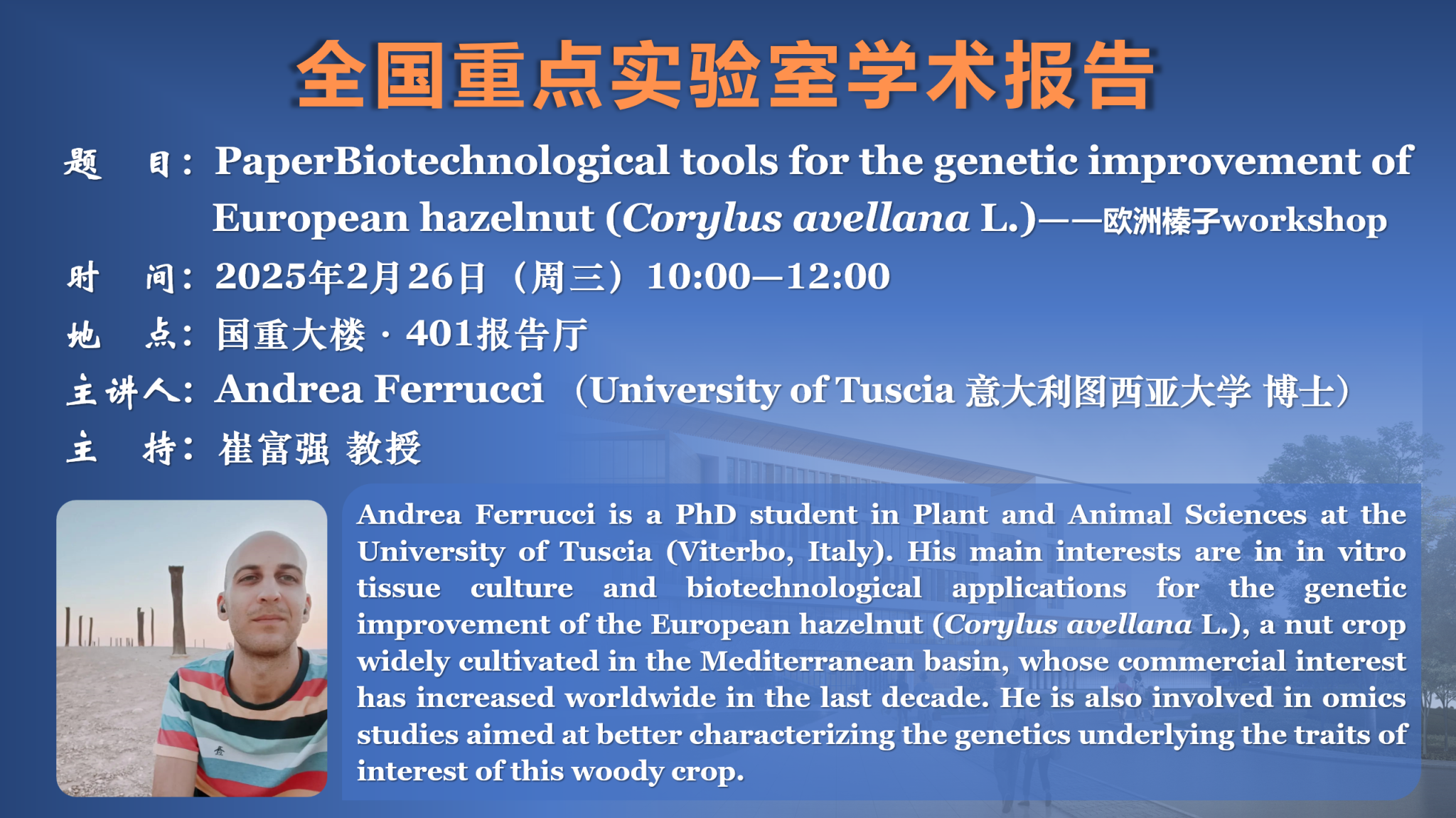 讲座预告:Biotechnological tools for the genetic improvement of European hazelnut (Corylus avellana L.)