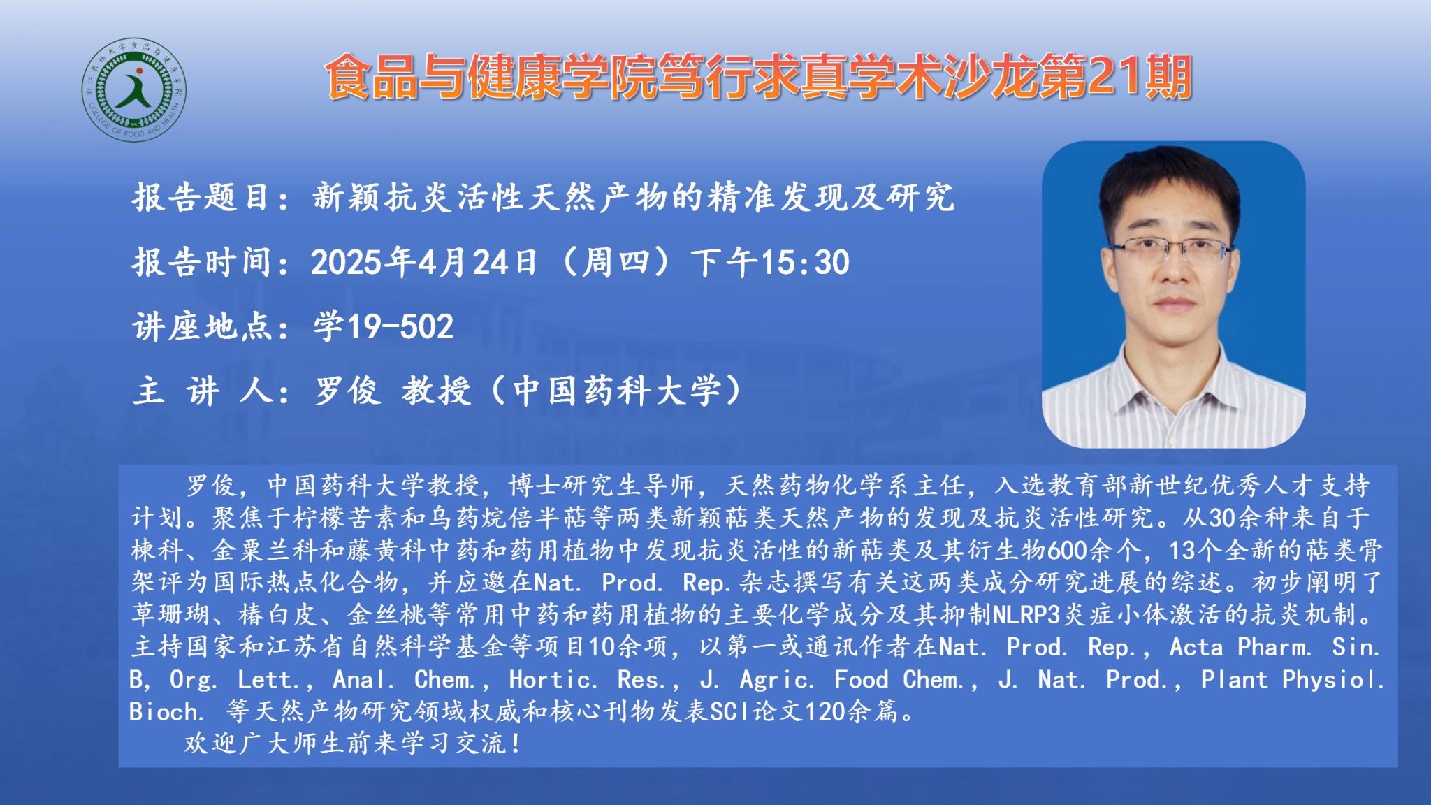 讲座预告:“笃行求真”学术沙龙——新颖抗炎活性天然产物的精准发现及研究