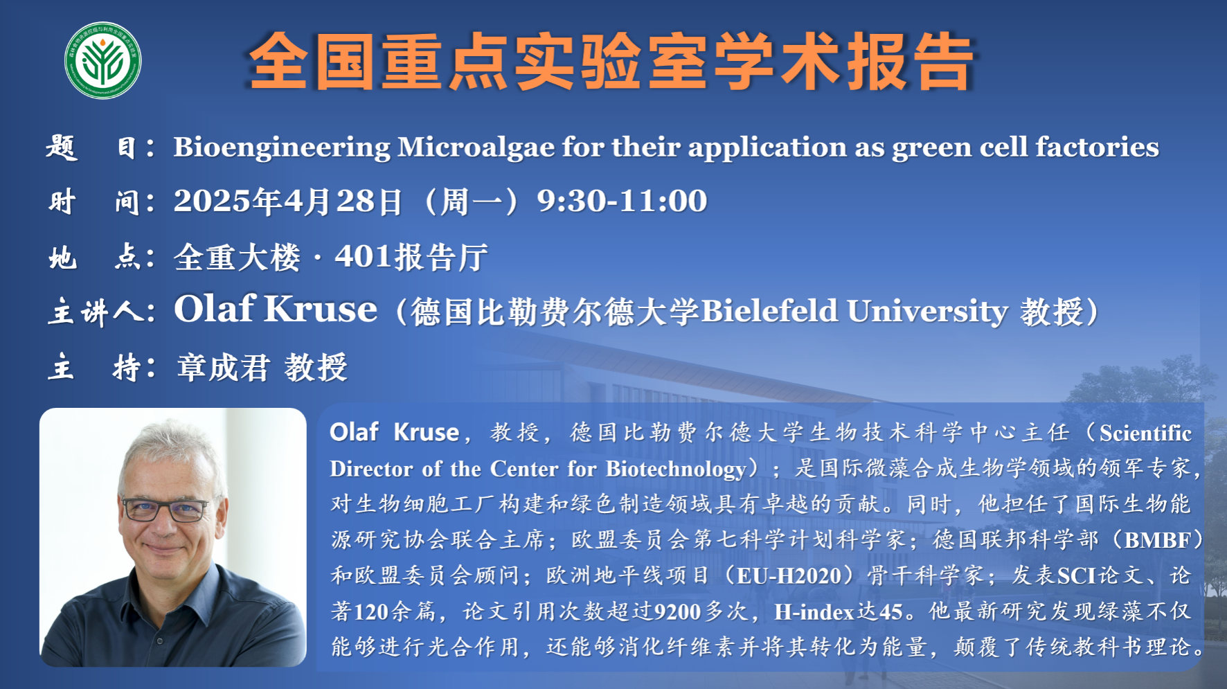 讲座预告:Bioengineering Microalgae for their application as green cell factories