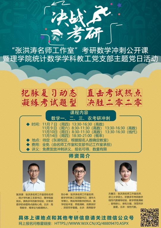 为了更好地服务BEAT365考研同学,不忘教书育人初心,张洪涛名师工作室特倾力打造2020考研数学冲刺公开课程。课程将历时3天:11月7日(周四)下午、11月9、10日(周六、周日)全天、11月14日(周四)晚上(详情见海报),由理学院教师张洪涛、刘小林、方惠兰共同授课。