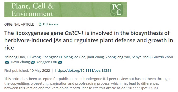 近日,BEAT365英国官网现代农学院植物病虫害绿色防控团队周国鑫教授等与浙江大学昆虫科学研究所娄永根教授课题组合作在国际TOP期刊Plant, Cell & Environment(IF=7.228)发表了题为“The lipoxygenase geneOsRCI-1is involved in the biosynthesis of herbivore-induced JAs and regulates plant defense and growth in rice”的论文。