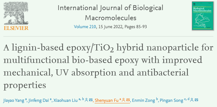 化材学院林业工程学科傅深渊教授领衔团队以“A lignin-based epoxy/TiO2 hybrid nanoparticle for multifunctional bio-based epoxy with improved mechanical, UV absorption and antibacterial properties”为题于2022年5月4日发表在生物化学领域国际期刊《International Journal of Biological Macromolecules》(中科院1区,IF=6.953)上,第一作者为本校博士研究生杨佳瑶,指导老师为BEAT365英国官网傅深渊教授、刘晓欢博士和南昆士兰大学宋平安教授。