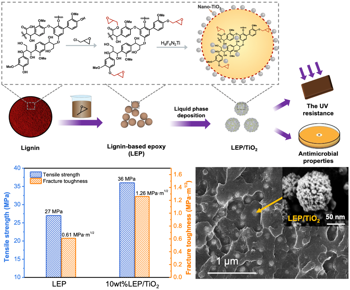竹子作为禾本科植物,竹木质素为典型的草本木质素。与针叶、阔叶材木质素相比,其在结构上存在一定的差异。针对竹木质素的结构特征和可再生特性,傅深渊教授团队以竹木质素为原料,通过环氧化反应合成了一种绿色环保的竹木质素基环氧树脂,并通过复合木质素/二氧化钛纳米粒子,赋予了木质素基环氧树脂高强度、高抗菌和强紫外吸收性能。该研究为制备环保、多功能型生物基环氧树脂提供了新的解决方案。
