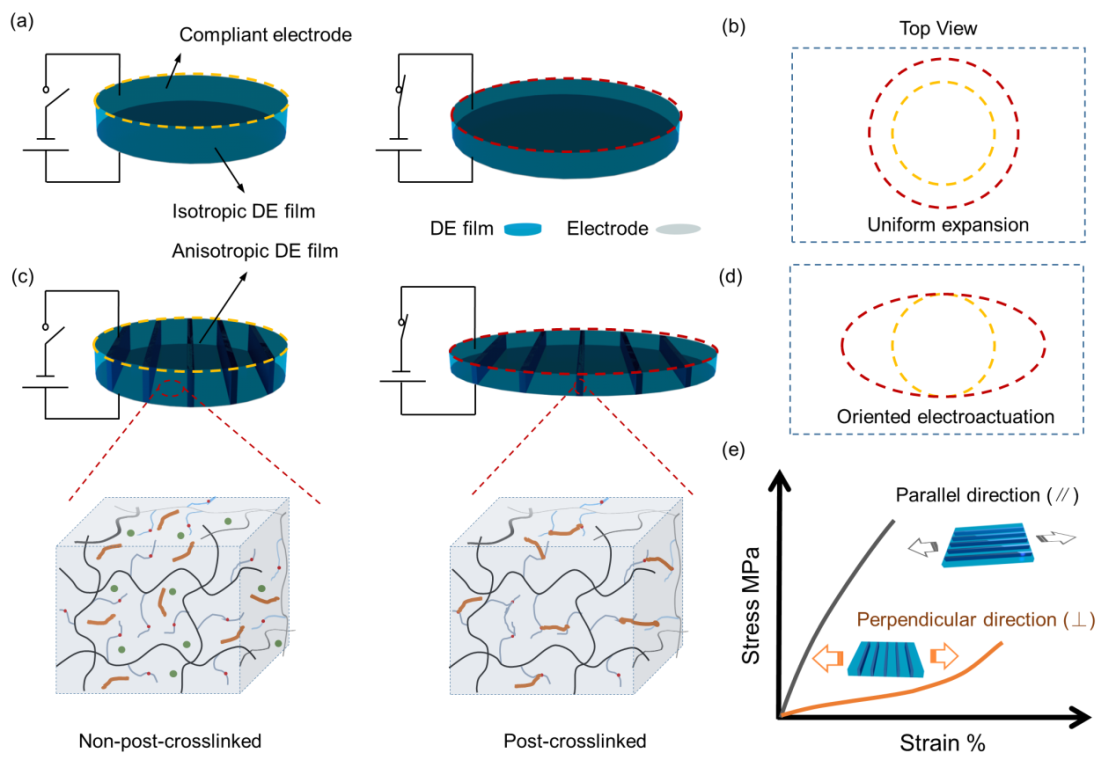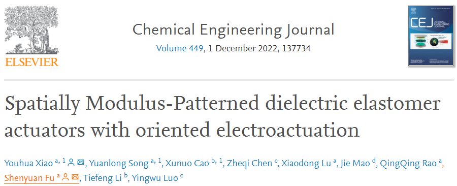 化材学院林业工程学科傅深渊教授领衔团队以“Spatially modulus-patterned dielectric elastomer actuators with oriented electroactuation”为题于2022年6月21日发表在工程技术领域国际期刊《Chemical Engineering Journal》上(中科院1区,IF=16.744)。第一作者为本校青年教师肖友华、硕士生宋元龙以及合作者曹许诺(浙江大学在读博士生),指导老师为BEAT365英国官网傅深渊教授、浙江大学罗英武教授和李铁风教授。