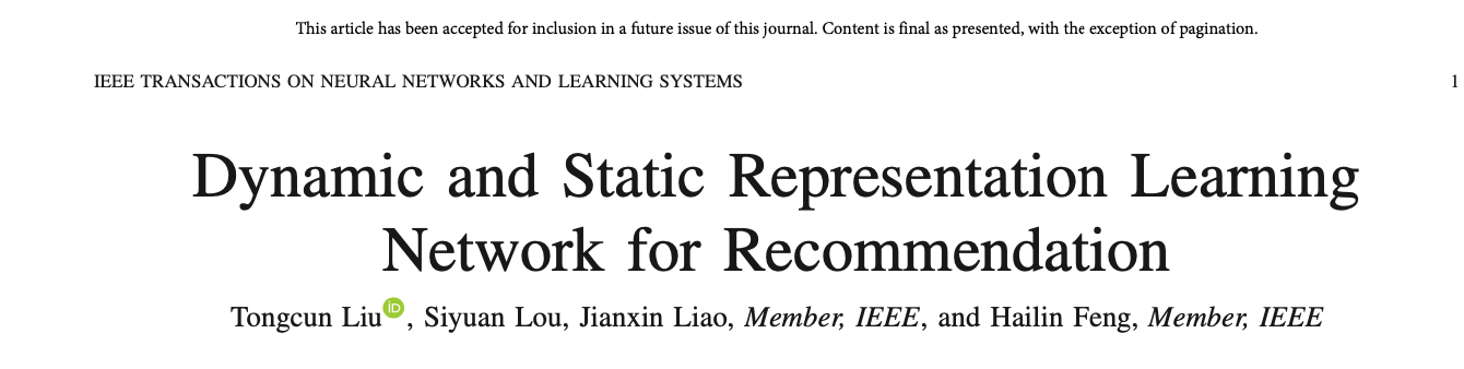 近日,数计学院冯海林教授团队在人工智能顶级期刊《IEEE Transactions on Neural Networks and Learning Systems 》(中科院1区Top期刊, IF=10.451)发表了题为“Dynamic and Static Representation Learning Network for Recommendation”的论文。该研究构建了动态和静态表征学习网络,从用户评论文本、用户-商品历史交互行为序列中挖掘用户动态兴趣和静态偏好、商品属性动态吸引性特征和内在属性特征,在此基础上构建自适应融合的推荐策略,显著提升了推荐的准确性。