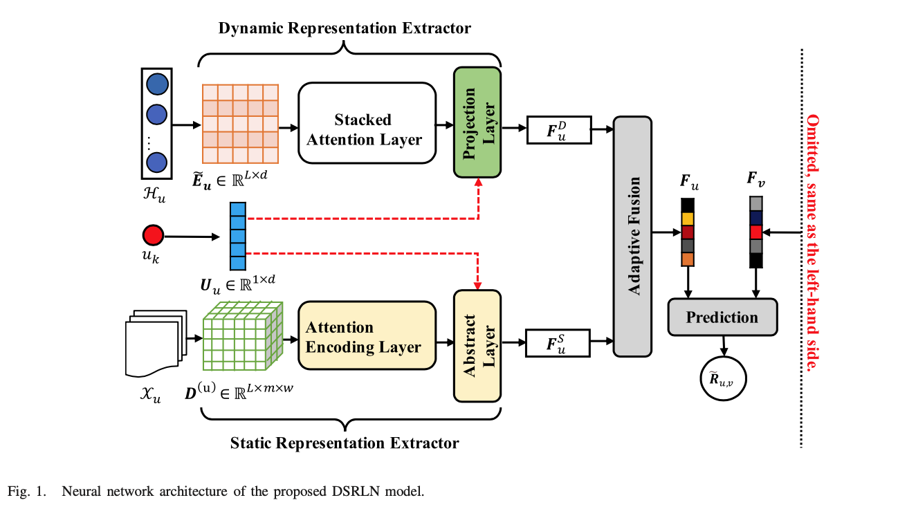 评论作为用户购买商品后的反馈,蕴含用户对所购买商品的真实偏好,从评论中挖掘用户的观点信息有助于提高推荐系统的推荐精度,提升用户满意度。现有的基于用户评论的推荐方法通常以静态方式获得用户偏好表征和商品属性表征,忽略了用户与项目交互历史中隐藏的时间信号和行为模式,无法捕捉用户兴趣的动态进化性和商品的动态吸引性。为此,论文提出了动态和静态表征学习网络(DSRLN)提升推荐预测的准确度。从用户短期交互序列的即时性和评论的静态性两方面来看,定义动态和静态特征在描述用户的短期和长期偏好之外,同时关注了商品的热点和固有属性特征。其次,基于注意力机制来构建模型,利用自注意力机制关注短期交互序列中物品的内在关系,应用多头注意机制来逐条处理评论文本信息,避免了特征强度信息的丢失,同时又保持语义一致性。最后,该论文提出了一个统一短期序列数据和文本信息的神经网络框架,其中自适应的融合用户短期和长期偏好所占的注意力权重,为用户实现“千人千面”建模。