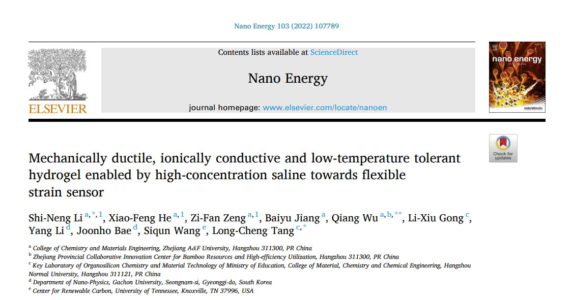 近日,化材学院林业工程学科生物质纳米材料研究团队以“Mechanically ductile, ionically conductive and low temperature tolerant hydrogel enabled by high concentration saline towards flexible strain sensor”为题发表在工程技术领域国际期刊《Nano energy》上(中科院1区,IF=19.069)。论文第一作者为该学科青年教师厉世能博士,吴强教授为论文通讯作者之一,韩国嘉泉大学的Joonho Bae(裴俊浩)和美国田纳西大学王思群教授参与该项研究并做出了重要贡献。
