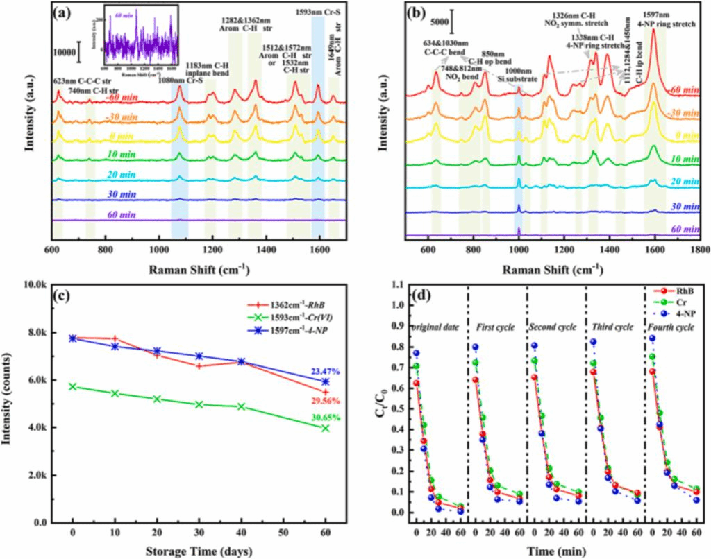 金纳米粒子因为具有由于独特的表面等离子体共振效应和出色的内部电子转移能力,它已被广泛用于各种光氧化反应。戴朝卿教授团队将不同大小的金胶体粒子修饰在十二面体的ZIF-Co/Zn的骨架表面。在模拟可见光下通过光催化处理罗丹明B/Cr(VI)混合溶液(RhB/Cr(VI) 20 mg/L)和4-硝基苯酚溶液(4-NP 20 mg/L)研究了Au@ZIF-Co/Zn的光催化活性。并且利用原位拉曼技术,实现了重金属离子以及有机污染物的动态监测。这项工作可能会提供一个新的构建金属有机框架的策略,用于净化重金属离子、有机污染物和医药中间体混合的废水。