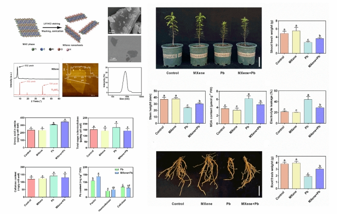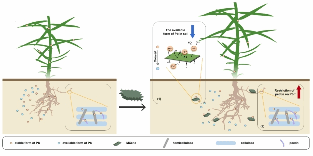 研究结果表明,在土壤中施加MXene后,可以有效抑制香榧体内铅离子的积累,从而增强香榧幼苗对铅胁迫的耐受性。该团队的进一步研究,则揭示了MXene抑制香榧体内铅离子积累的作用机制:一方面,土壤中MXene通过其吸附能力,将土壤中有效态铅转变成稳定态,从而减少香榧幼苗对土壤铅的吸收;另一方面,MXene通过调控香榧根中果胶合成/代谢相关基因的表达来提高果胶含量,进而将更多的铅离子固定在根细胞壁中,最终减少香榧体内铅离子积累。