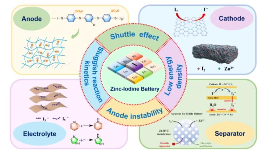 水系锌基电池由于其成本低、安全性高、环境友好的特点,近些年引起了广泛的研究兴趣。锌碘电池作为水系锌基电池的代表之一,通过一种转化反应机制实现电化学储能,从而摆脱了传统锌离子电池主要依靠离子嵌入、脱出的储能方式,避免了传统锌离子电池中正极材料结构坍塌的问题。此外,碘的低成本,多价态等性质以及较高的理论比容量(211 mAh g−1I2),使锌碘电池有望成为下一代清洁、高效储能器件的候选者之一。然而,锌碘电池仍面临着严重的多碘化物穿梭、缓慢的碘转化动力学,低能量密度以及锌阳极的不稳定性等问题,限制了锌碘电池的大规模应用。除此之外,过去较少关注锌碘电池中碘转化机理,因此需要对锌碘电池碘的电化学和转化机理进行系统总结,为高效锌碘电池的设计提供合理指导。