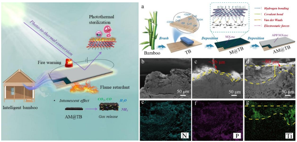 竹材及其制品是我国乡村振兴、碳达峰碳中和等重大战略中备受推崇的特色产品,但其易燃、易霉等固有缺点阻碍了广泛推广应用,这是当前制约竹材工业高质量发表的一大技术瓶颈。为此,杜春贵团队创建了一种低温挥发诱导自组装策略,通过充分发挥Ti3C2Tx(MXene)与预处理竹材(TB)之间的多重相互作用,在不使用胶粘剂的情况下,实现了具有防火、可重复预警与光热杀菌等功能的智能竹材的制备。与普通竹材相比,智能竹材具有优异的阻燃性能:极限氧指数降低65.8%、热释放率降低80.3%、残余物质量增加1.6倍;具有灵敏的火灾响应和重复预警性:响应时间不超过2s,重复预警次数大于10次;具有出色的光热转换性能,在近红外激光(NIRL)照射后表现出较好的杀菌效果。该项研究为设计和制造兼具阻燃、抗菌、火灾预警预报等功能的生物质材料提供了灵感。