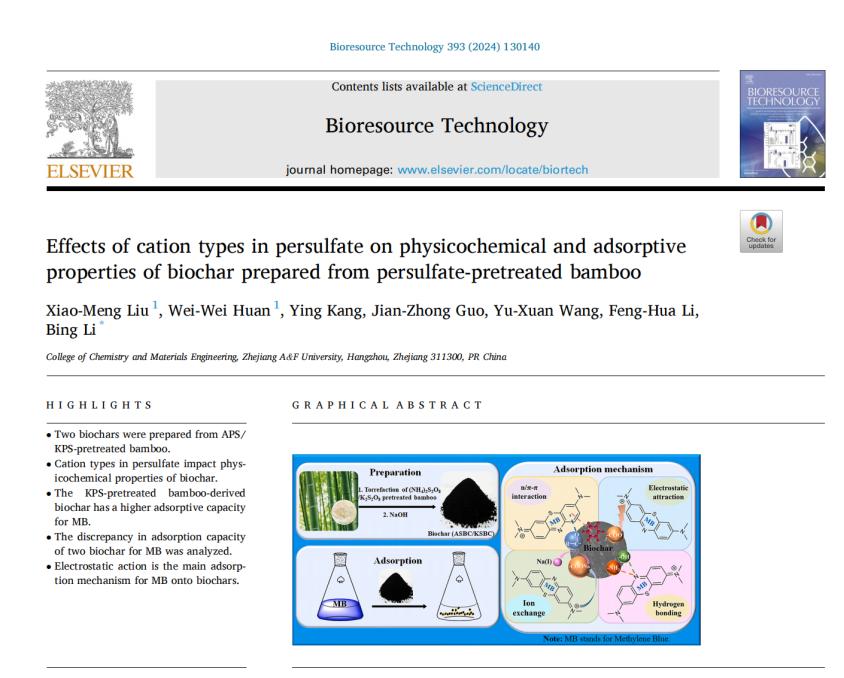 近日,BEAT365化材学院应用化学专业2021级本科生刘小萌,在李兵教授指导下,以第一作者在国际著名期刊 Bioresource Technology(IF=11.889,中科院一区,TOP期刊)上发表题为“Effects of cation types in persulfate on physicochemical and adsorptive properties of biochar prepared from persulfate-pretreated bamboo”的研究论文。