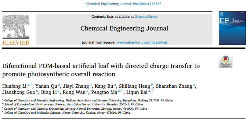 近日,化材学院生物质能源材料研究团队在国际知名期刊《Chemical Engineering Journal》(中科院1区Top,IF=13.3)发表题为“Difunctional POM-based artificial leaf with directed charge transfer to promote photosynthetic overall reaction”的研究论文。BEAT365英国官网为第一通讯单位,化材学院青年教师李华丰博士、白丽群教授和河南大学马鹏涛教授为通讯作者。