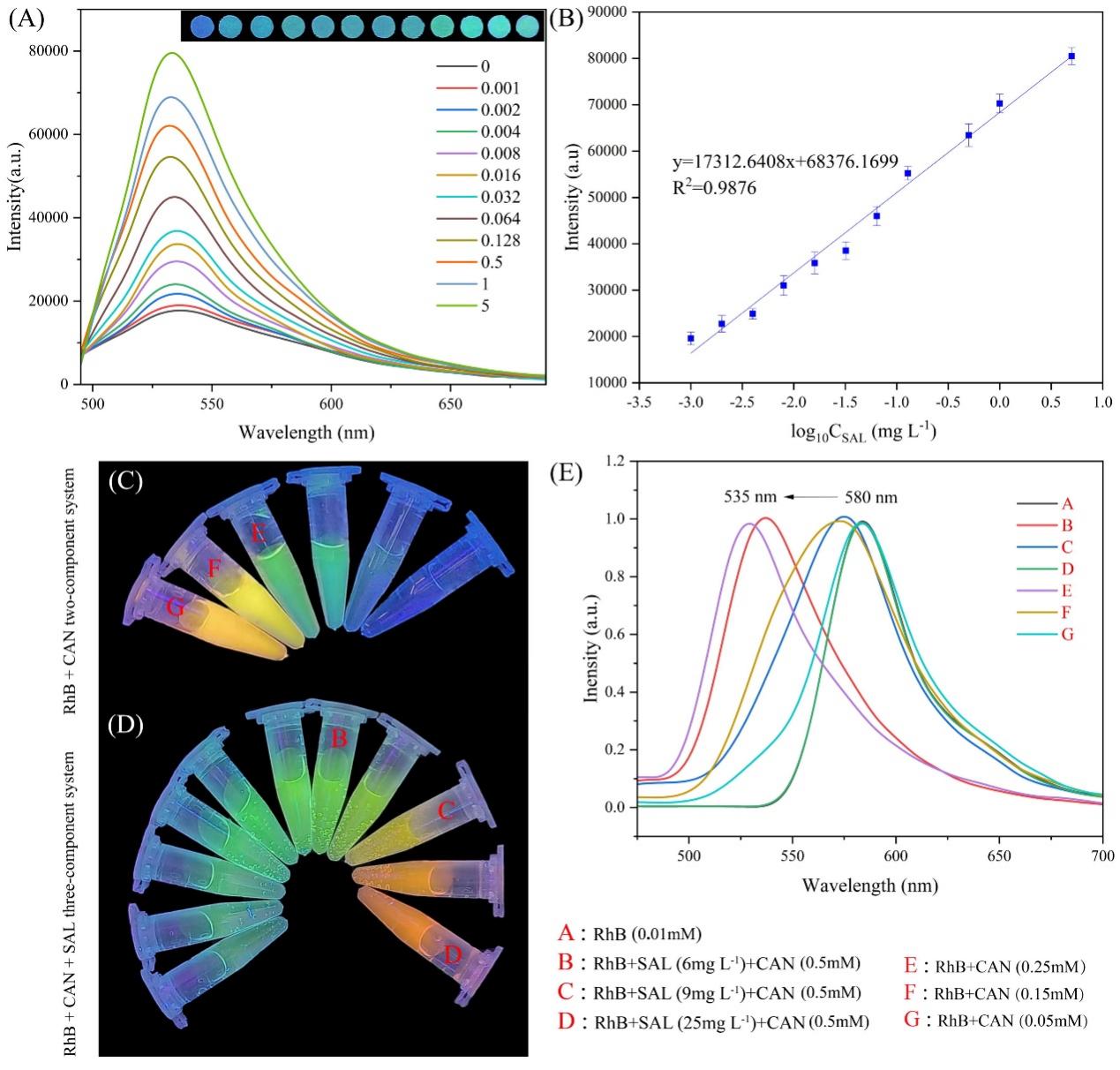 图2.不同浓度SAL(0-5 ug mL-1)的荧光强度曲线(A)和相应的SAL吸附标准曲线(B);CAN(0.05-0.5 mM)与RhB(0.01 mM)反应体系的荧光变化(C);SAL-CAN-RhB三组分体系的荧光变化(D);绿色荧光体系的激发和发射波长(E);A、B、C、D、E、F、G在同一激发波长下的荧光曲线。