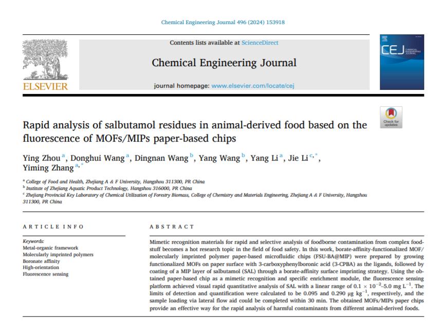 近日,食品与健康学院张宜明教授团队在化学工程领域期刊《Chemical Engineering Journal》(CEJ,中科院1区TOP,IF2024=13.3)上在线发表了题为《基于荧光MOF/MIPs纸基芯片快速检测动物源性食品中的沙丁胺醇》(Rapid analysis of salbutamol residues in animal-derived food based on the fluorescence of MOFs/MIPs paper-based chip)的研究论文。
