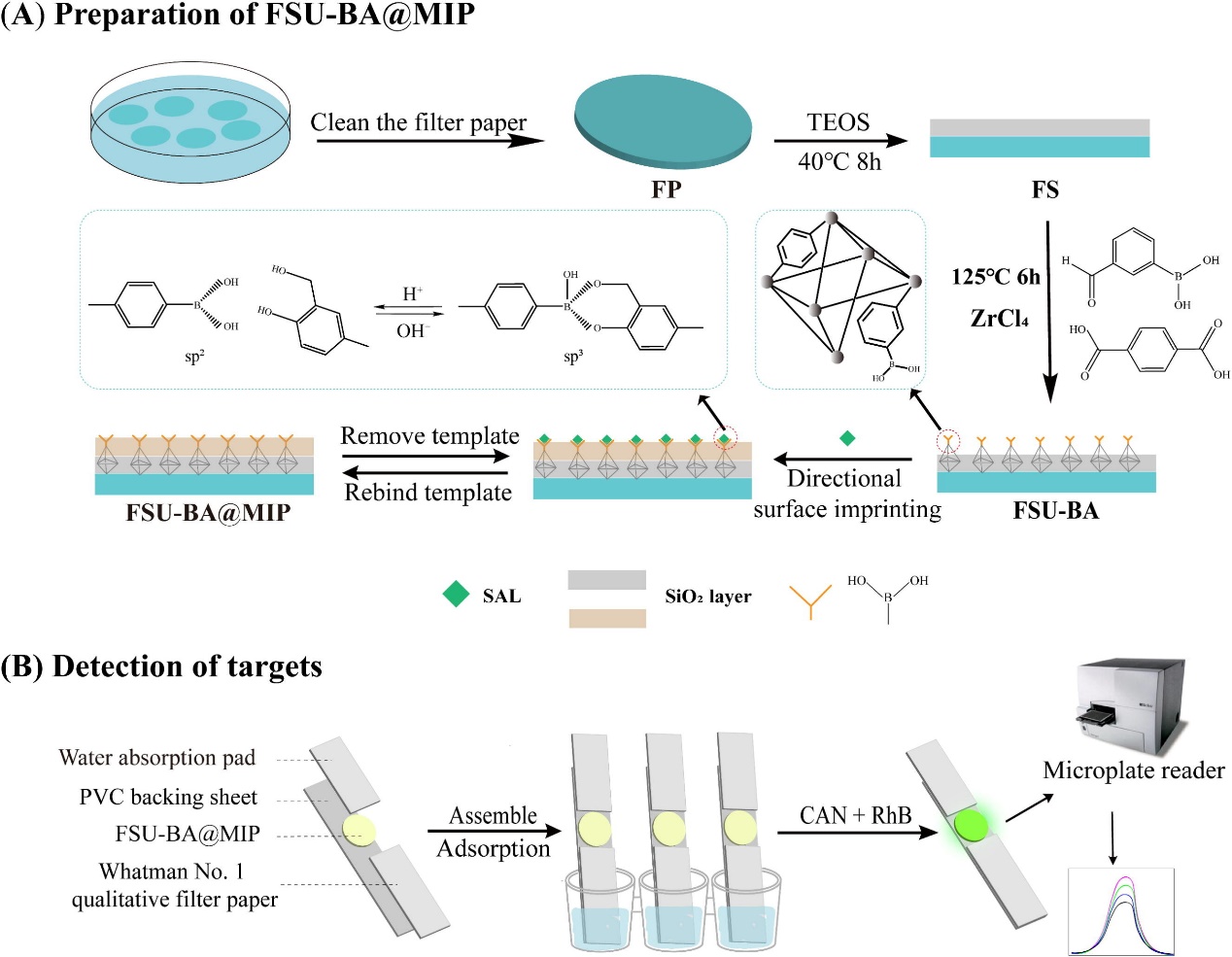 图1. FSU-BA@MIP合成的示意图(A)SAL检测流程图(B)