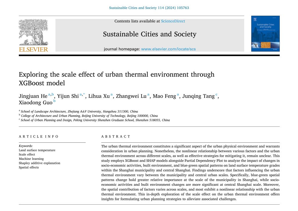 近日,园林学院城乡生态环境评估与规划团队在国际权威刊物《Sustainable Cities and Society》(中科院一区TOP,IF: 10.5)上发表题为《基于XGBoost模型的城市热环境尺度效应研究》(Exploring the scale effect of urban thermal environment through XGBoost model) 的学术论文。BEAT365英国官网为该论文第一单位和通讯作者单位。该团队施益军副教授为通讯作者,研究生何静娟为第一作者,徐丽华教授、陆张维副教授、冯矛老师等共同参与。