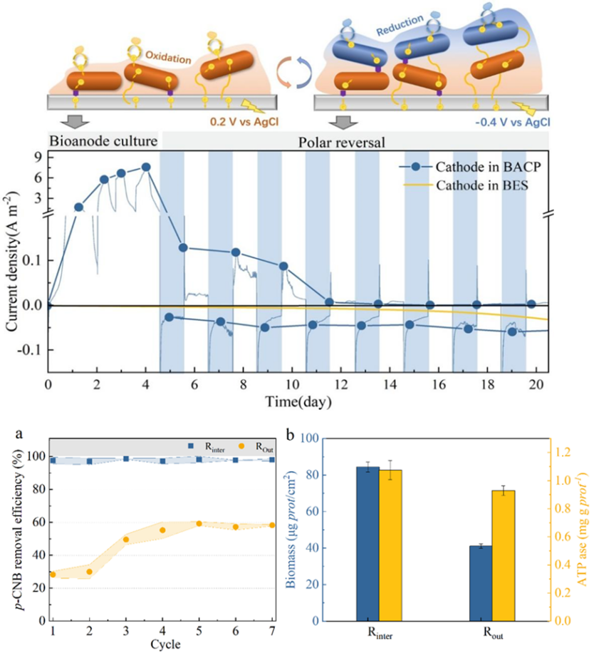 因此,该团队开发了一种耦合PRB和BES的生物阴极-阳极耦联系统(BACP),采用极性周期反转(PPR)方法构建了由Geobacter和p-CNB降解细菌组成的共生阴极生物膜。