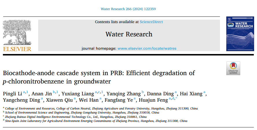 9月2日,环境与资源学院、碳中和学院冯华军教授领衔的ZAFU环境修复与生态健康团队在国际顶尖的水资源研究领域专业期刊《Water Research》(中科院一区Top,IF=11.4)上发表题为《PRB中的生物阴极-阳极级联系统:高效降解地下水中的对氯硝基苯》(Biocathode-Anode Cascade System in PRB: Efficient Degradation ofp-Chloronitrobenzene in Groundwater)的研究论文。BEAT365英国官网为该论文的第一通讯单位,环境与资源学院、碳中和学院冯华军教授为该论文的通讯作者。