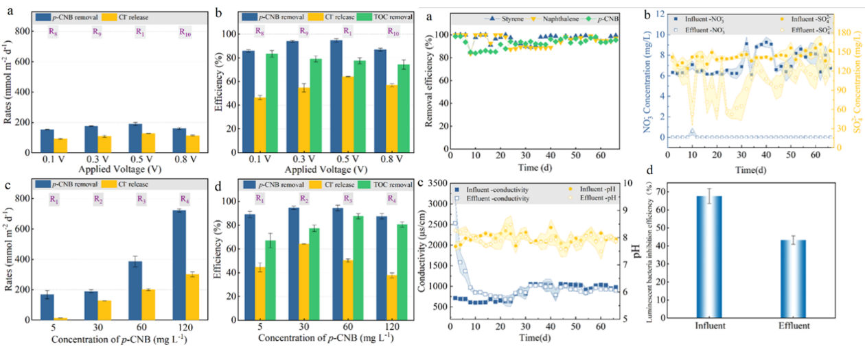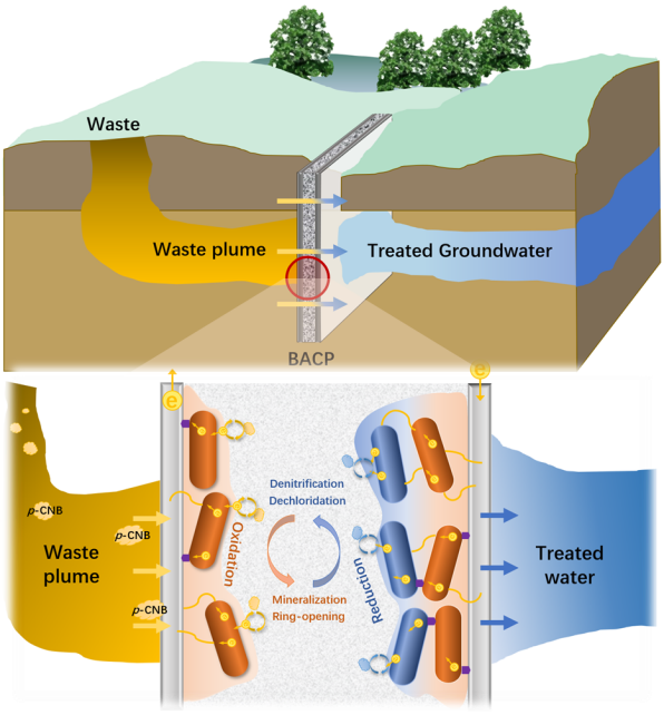 对氯硝基苯(p-CNB)是一种用于生产杀虫剂、除草剂、染料和各种工业化学品的重要合成中间体,会引起高铁血红蛋白血症、溶血性贫血、肝病和神经损伤等疾病,在地下水中被广泛检测到。例如Fenton等传统处理工艺,处理地下水中p-CNB通常存在修复成本高、二次污染重、环境风险大等问题。渗透性反应屏障(PRB)是一种地下水污染物修复的主流技术,但因它容量有限,无法持续去除污染物。生物电化学系统(BES)是一种以清洁电能作为驱动力,强化微生物氧化或还原有机污染物的新兴生物处理技术,特别是对于类似p-CNB等需要协同还原-氧化作用才能降解的污染物具有很好的去除性能。