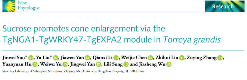 近日,国家重点实验室特色干果研究团队(吴家胜教授)在国际植物科学领域权威杂志《New Phytologist》(中科院一区Top,IF-5yr=10.2)在线发表了题为《蔗糖通过TgNGA1-TgWRKY47-TgEXPA2模块参与调控香榧球果膨大》(Sucrose promotes cone enlargement via the TgNGA1-TgWRKY47-TgEXPA2 module inTorreya grandis)的研究论文,首次解析了调控香榧球果膨大的新机制。
