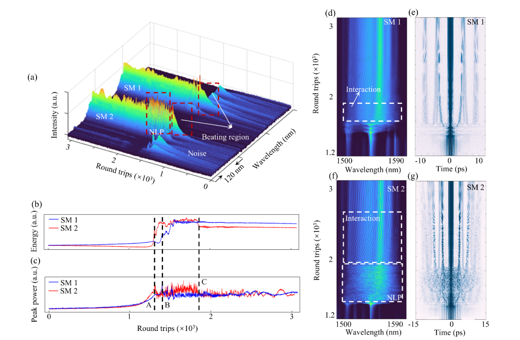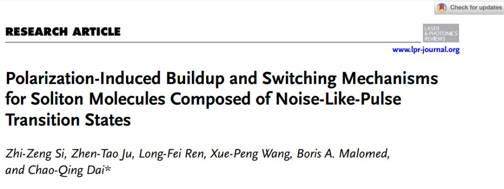 近日,光机电工程学院戴朝卿教授领衔的先进光电子应用基础交叉研究中心科研团队在光学领域国际权威期刊《Laser & Photonics Reviews》(中科院1区TOP,五年影响因子:11.1)上发表了题为《极化诱导的涉及类噪声过渡态的孤子分子累积与切换机制》(Polarization-Induced Buildup and Switching Mechanisms for Soliton Molecules Composed of Noise-Like-Pulse Transition States) 的研究论文。这是该研究团队近两个月内第二次在该期刊发表高水平文章,首次在高强度光场中揭示了孤子抵抗强非线性效应而发生的新型建立与切换机制,这不仅在理论上丰富了非线性光学和孤子动力学的研究内容,还在实际应用中展示了其潜在的巨大价值,为光学信息处理技术的发展开辟了新的方向。