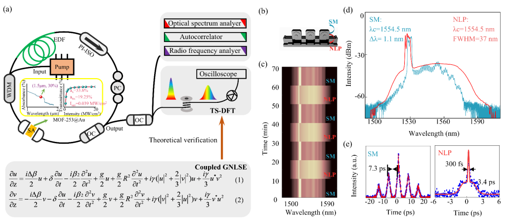 在现代光学和非线性光学领域,非线性孤子动力学的研究具有重要的理论和应用价值。特别是在高强度光场下,光学系统中的噪声和强非线性效应导致孤子行为的不可预测性,探索一种能够在强非线性环境中稳定存在的孤子构建和切换机制,对于提升光学系统的性能具有重要意义。戴朝卿教授团队针对强光场环境下的孤子稳定性,设计了一种新型的强非线性光学系统,包括饱和吸收体金属有机框架(MOF-253@Au)和极化控制器,揭示了孤子分子在复杂非线性系统中的动态行为。研究发现,强非线性下孤子分子为抵抗光学腔中的“湍流”,在建立阶段会形成一种长时间的类噪声脉冲过渡态。通过极化诱导,多脉冲态下由交叉相位调制效应主导的孤子分子与类噪声脉冲之间的切换机制也被剖析,主要涉及谱崩溃与振荡以及噪声态到自组织过程。理论上综合分析了极化角度对孤子态周期性相变的影响,并准确再现了实验中观察到的构建和切换机制。