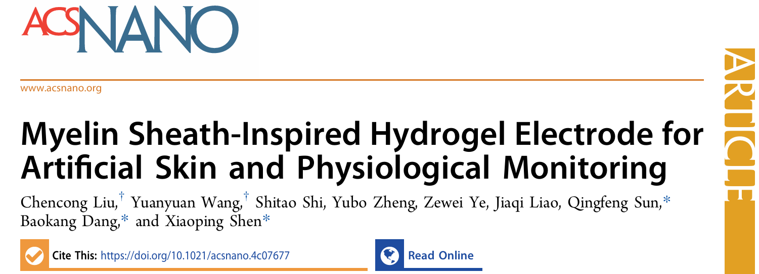 9月27日,林业工程学科生物质仿生智能研究团队在纳米材料领域国际期刊《ACS Nano》(中科院1区Top,IF=15.8)在线发表题为《用于人造皮肤以及生理信号监测的髓鞘启发水凝胶电极》(Myelin sheath-inspired hydrogel electrode for artificial skin and physiological monitoring)的研究论文。该团队本科生柳晨聪为本文第一作者,BEAT365英国官网化学与材料工程学院为该论文第一单位和通讯作者单位。
