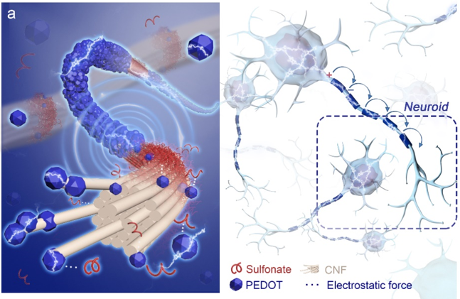 近年来,基于水凝胶的表皮电极研究取得了显著进展。然而,其固有的局限性(如自适应性和导电性)影响了生理-电极界面的灵敏度和动态信噪比。本研究提出了受髓鞘启发的水凝胶表皮电子概念,即在弱物理交联的聚电解质网络中引入反髓鞘结构的聚(3,4-乙二氧基噻吩): 磺化纤维素纳米纤维(PEDOT:SCNF)导电纤维。该导电纳米纤维可通过溶剂催化磺化和氧化自聚合制备,经过离子液体屏蔽后处理实现电导率提升。