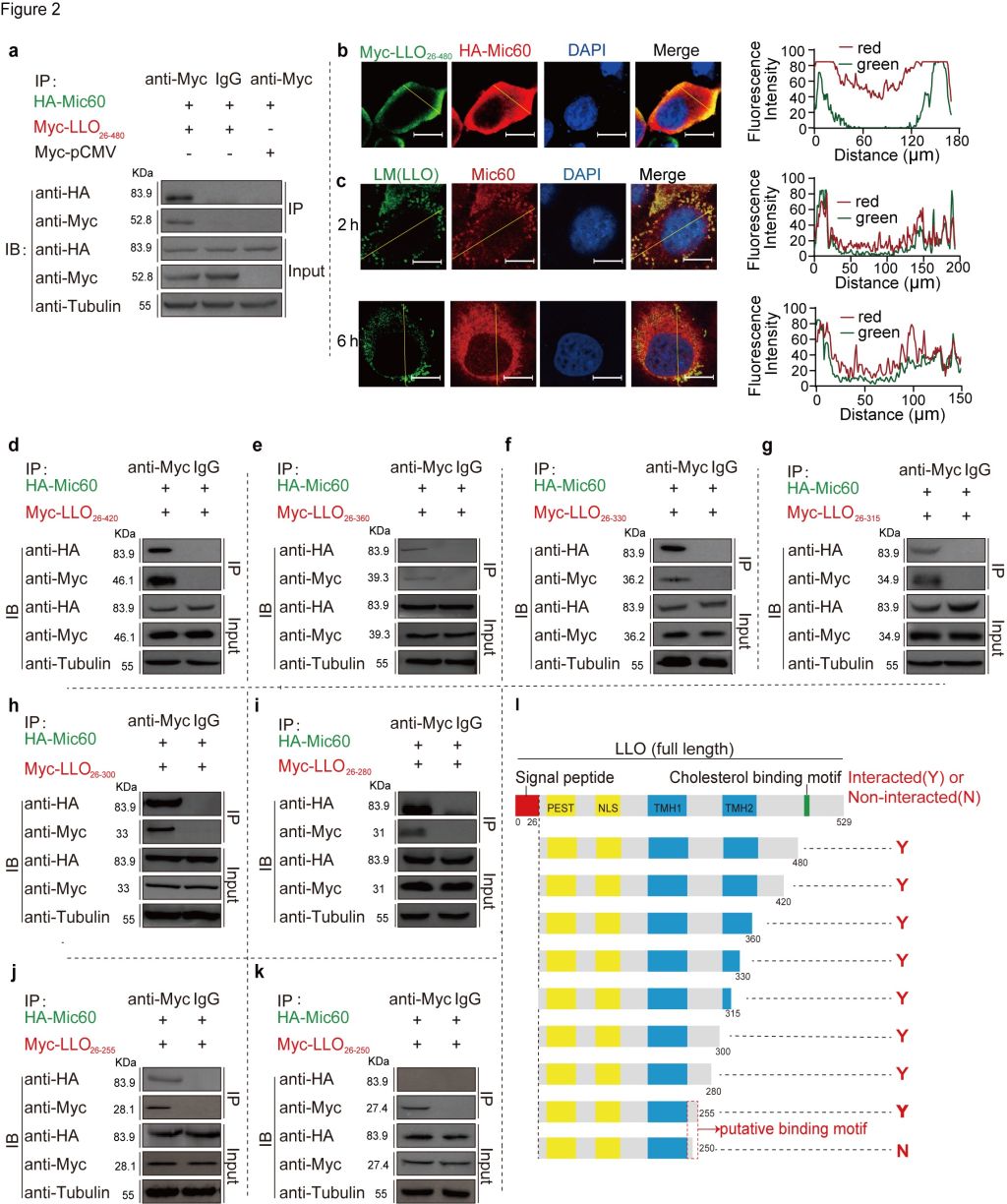 论文主要发现之一:单增李斯特菌毒力因子溶血素LLO与宿主线粒体膜结构蛋白Mic60的互作关键结构域和氨基酸位点
