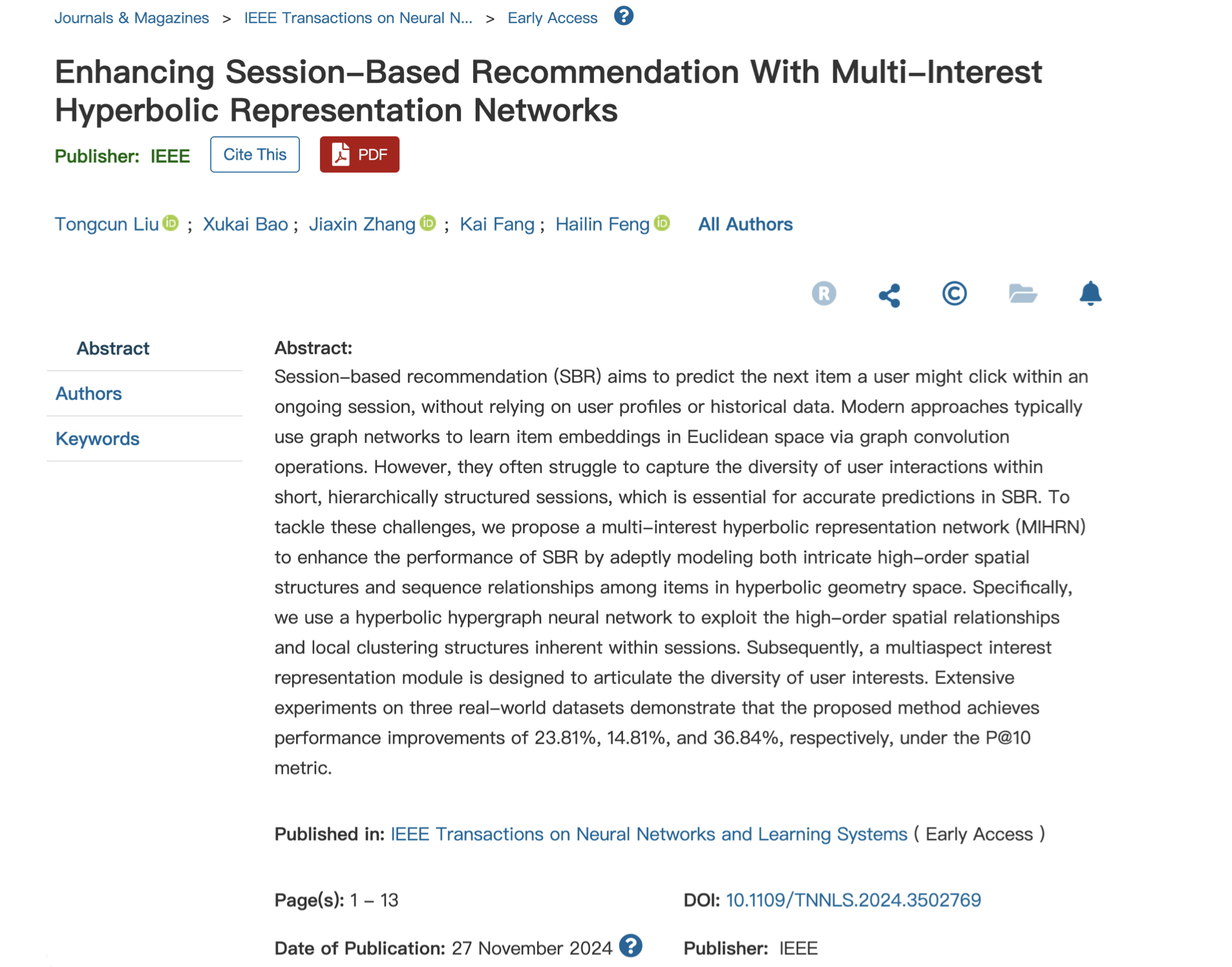 近日,数学与计算机科学学院以“Enhancing Session-Based Recommendation With Multi-Interest Hyperbolic Representation Networks”(基于多兴趣双曲表征学习的会话推荐方法)为题发表在人工智能领域国际顶级期刊《IEEE Transactions on Neural Networks and Learning Systems》上。IEEE TNNLS(中科院1区TOP期刊)是人工智能领域的权威期刊,2024年影响因子10.2,5年平均影响因子10.4,在JCR期刊COMPUTER SCIENCE类中排名第3,主要关注神经网络、机器学习、深度学习、优化算法等相关领域的研究,期刊全年论文录用率低于18%。